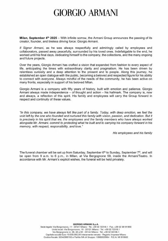 阿玛尼品牌表示,“怀着无限的悲痛宣布其缔造者、创始人和孜孜不倦的推动者乔治·阿玛尼去世。”并表示,乔治·阿玛尼在亲人环绕中平静离开。他至生命最后一刻仍不知疲倦,将心力倾注于品牌、系列作品,以及未来的构想与计划。